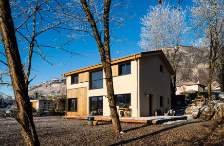 Maison Ossature Bois à Voiron (38). Charpente en lamellé-collé. Bardage Mélèze et menuiseries en aluminium. Réalisation de cette maison ossature bois grâce à des murs ossatures bois préalablement fabriqué dans nos ateliers Charpente de type traditionnelle avec pannes apparentes à l’intérieur de la maison Création d’une baie coulissante avec volet coulissant pour l’accès […]